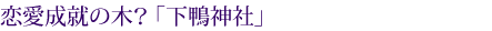 そして下鴨神社は縁結びの神としても知られ、神社で結婚式を挙げる人も多くいます。 とま郎君、この下鴨神社に立派な福の神になった暁にはプロポーズできる素敵な女神様が現れますようにと訪ねてまいりました。 勉学に励む中、将来設計にも抜かりありませんね。 とま郎君がやってきたのは、楼門の手前にある小さな社「相生社」。ここはとま郎君にとっては大先輩でもある宇宙創造を行った三神の一人、神皇産霊神(かむむすびのかみ)が祀られる社で古来から縁を結ぶ神として崇められておられます。 神皇産霊神のパワーがあまりにも凄く、社の中に立つ樹木がその力に引かれて二本の木が途中から交わって一本になっているほどです。 この木は「連理の賢木」と呼ばれ相生社の神木として信仰の対象ともなっているのです。 とま郎君、絵馬を持って相生社と連理の賢木の周りを3回まわります。 女性なら反時計回り。男性は時計回り。とま郎君は時計回り。 持っていた絵馬を絵馬掛けに奉納し、最後に二礼・二拍手・一礼のお参りをして良いご縁があるようお願いしました。